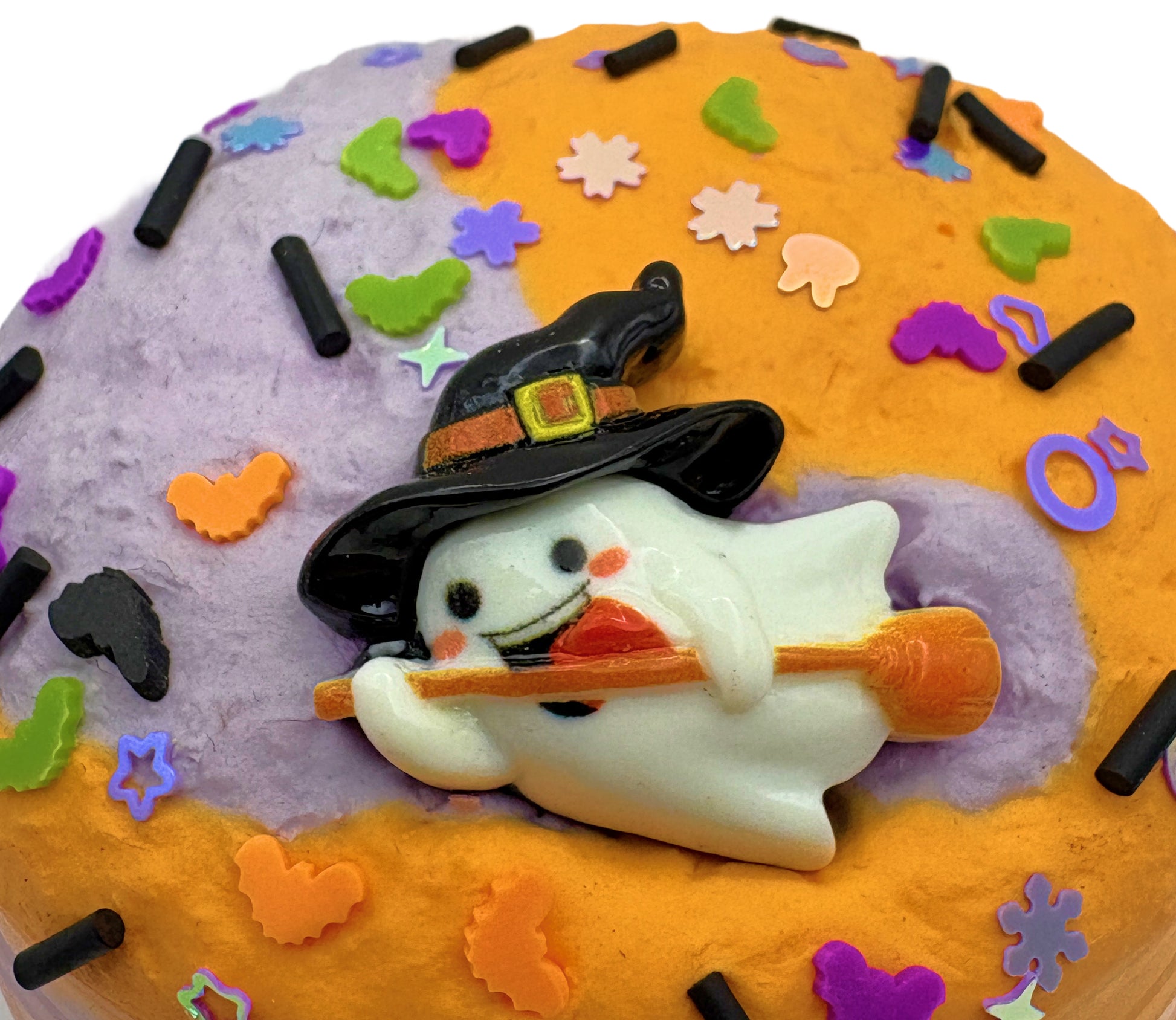 Ghostly Glow is a bright swirl of orange and purple Butter Fizz slime, topped with a cute flying ghost charm. This Halloween slime has a soft and spreadable texture with just the right amount of fizz for a fun, squishy experience. Perfect for anyone who loves soft slime with a spooky twist!