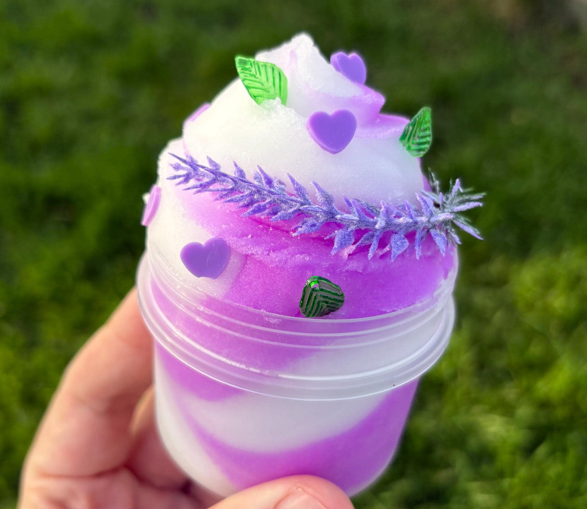 Lavender Meadow is a dreamy two tone icee slime with soft, scoopable texture and loads of sizzly, stretchy fun. It’s swirled in calming white and lavender purple, then topped with a faux lavender sprig and cute fimo slice details to give it that fresh meadow vibe in a jar.