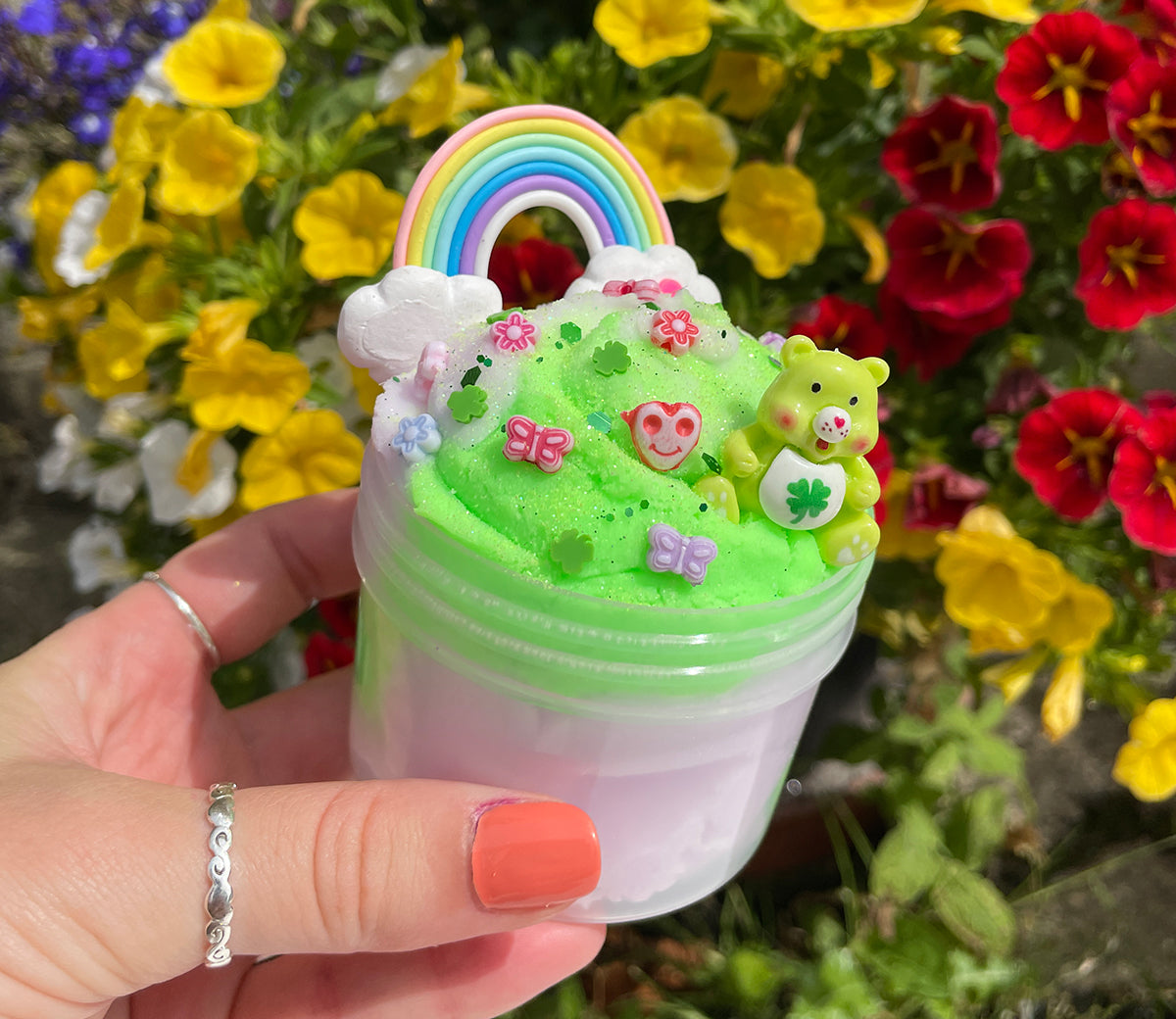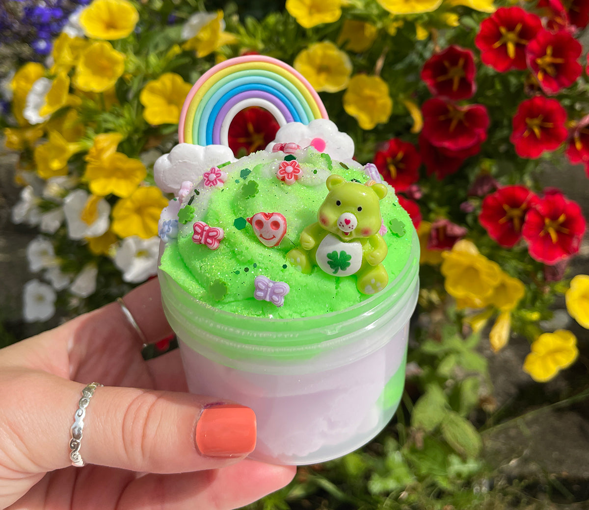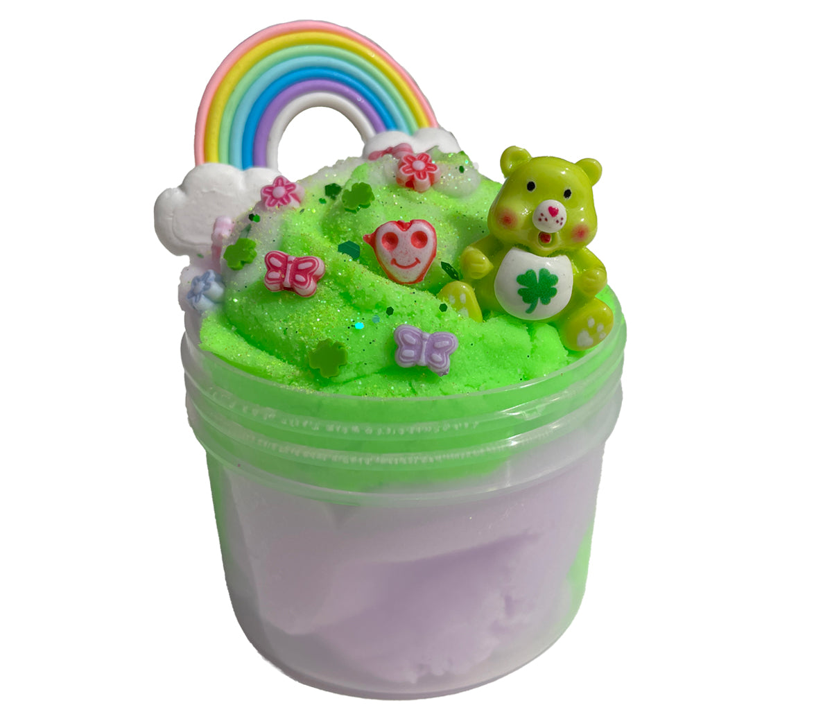 Care Bear inspired cloud slime. This slime has the softest texture and most delicate fragrance with drizzles and sizzles to mesmerise any slime connoisseur. Pastel green and lilac with green and silver butterfly shaped glitter, with green and lilac resin flower charms and the all important Good Luck bear.